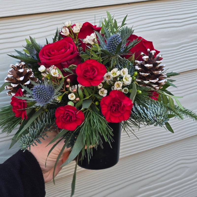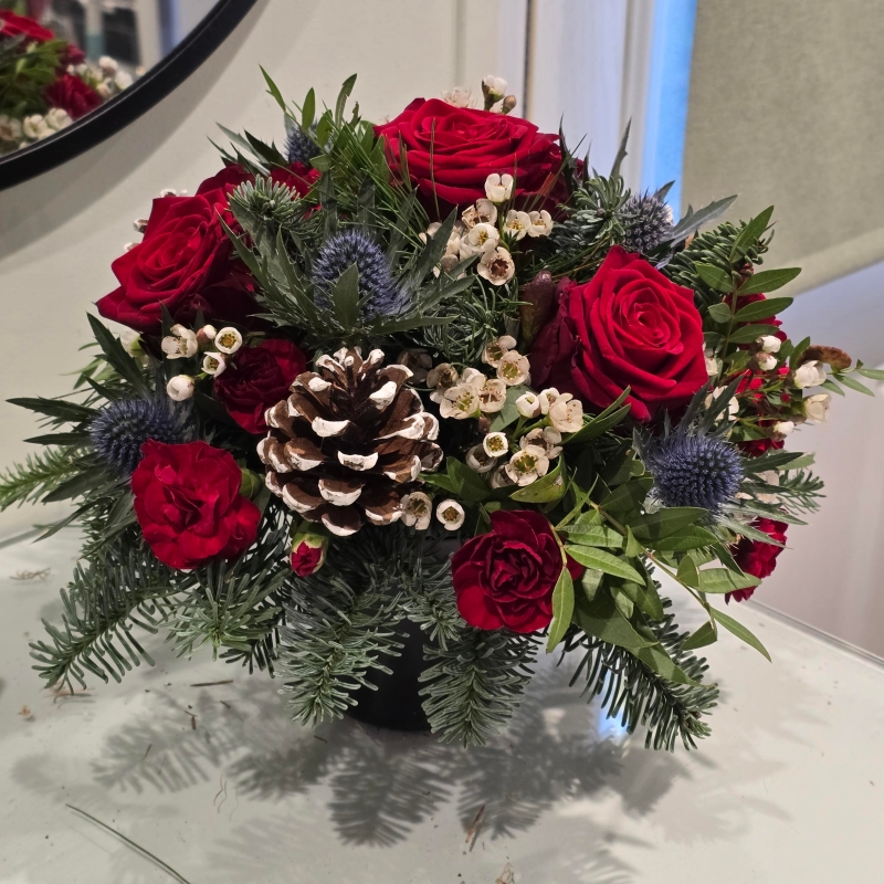 Arranged using a mixture of fresh premium foliage & flowers including Eucalyptus, Pine, Spruce & Pistache along with Roses, Eryngium, Wax & Carnations.
