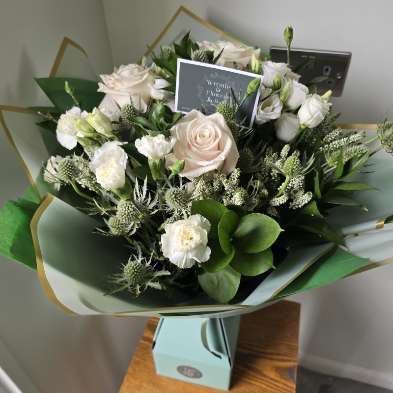 Classic elegance in every stem. Crisp whites and fresh greens are combined in a premium hand-tied bouquet, designed to exude sophistication and luxury. Perfect for those who appreciate understated beauty and refined style.